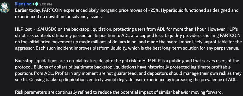 In news from the core team, we got a quick update about the volatility of FARTCOIN perps and its effect on the HLP (Hyperliquidity Provider) vault, which lost ~1.6m USDC backtopping a liquidation.